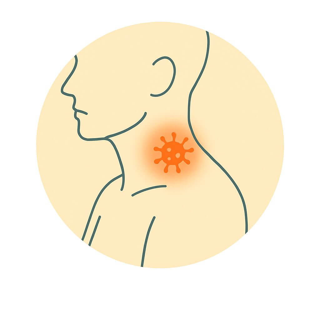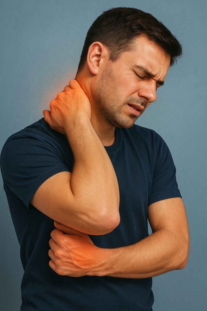 Muscle strain in the neck or shoulders from overuse or poor posture can cause pain, stiffness, and reduced mobility.