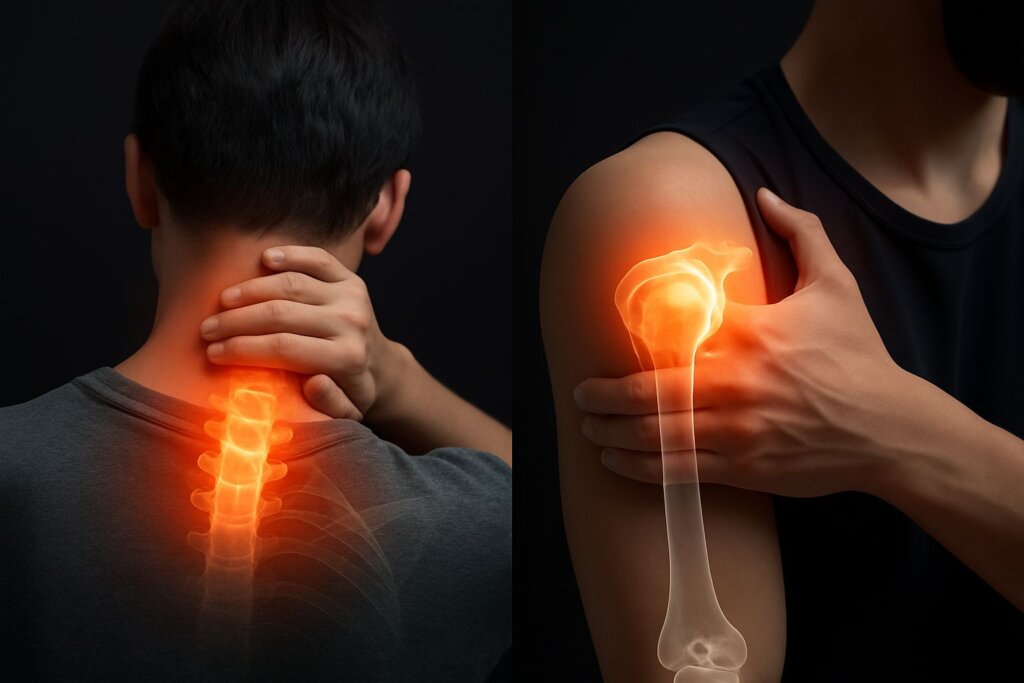 Nerve compression in the neck from herniated discs or bone spurs can cause radiating arm pain, numbness, and weakness.